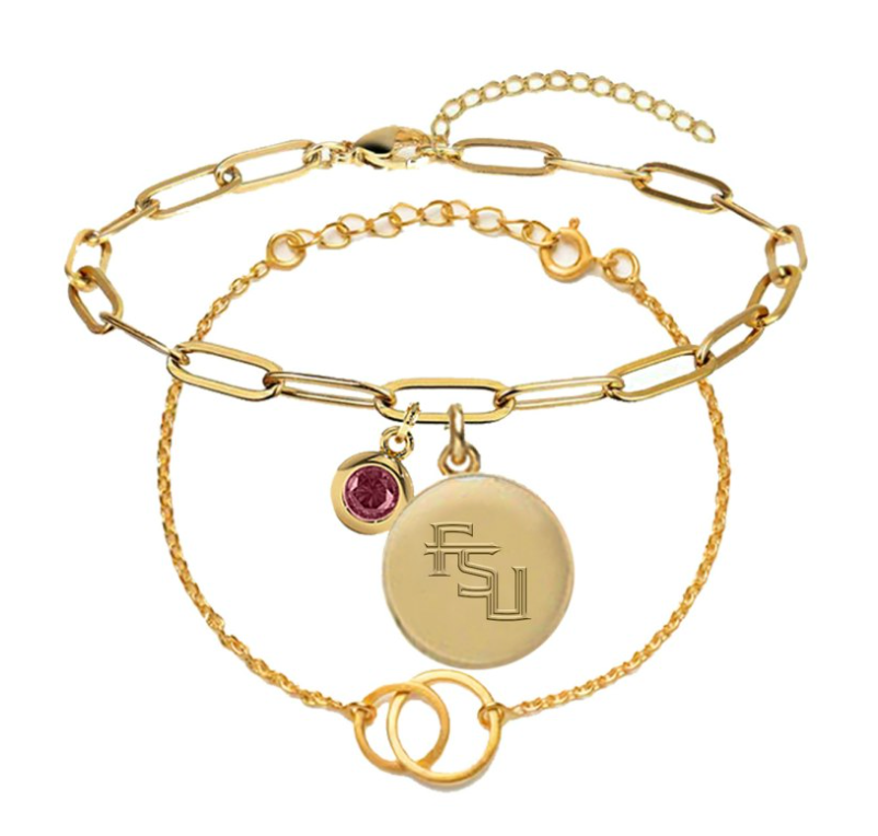 The Jacaranda Bracelet is a stylish two-piece set designed to showcase your school spirit with a fashionable twist. One bracelet features a sleek pendant with your school’s logo with a gemstone in your team’s signature color. Perfect for stacking together or wearing separately, this versatile set adds the right mix of pride and polish to any outfit—whether you’re heading to class, game day, or a night out.