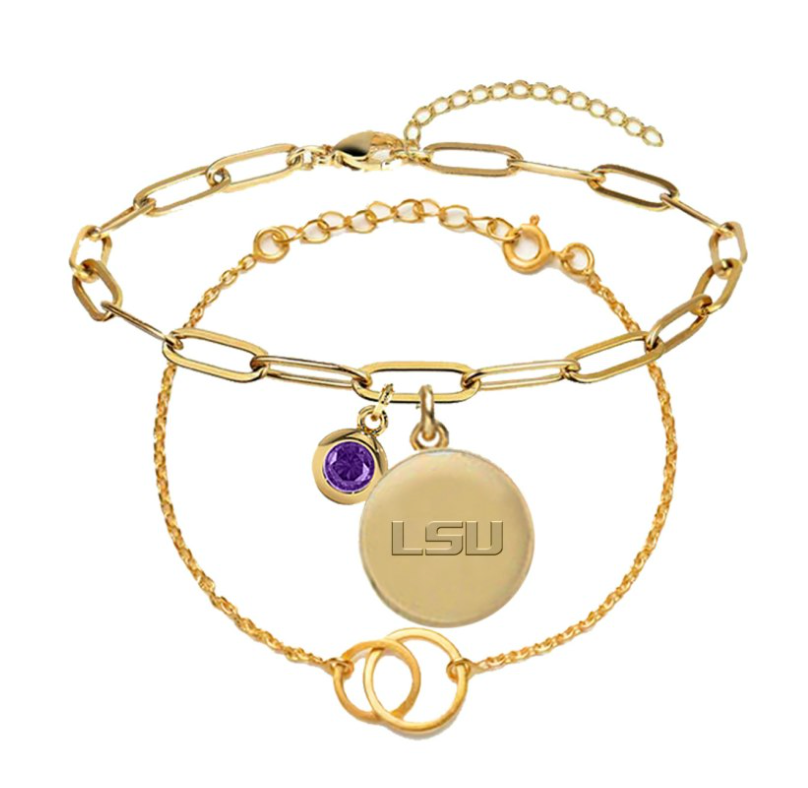 The Jacaranda Bracelet is a stylish two-piece set designed to showcase your school spirit with a fashionable twist. One bracelet features a sleek pendant with your school’s logo with a gemstone in your team’s signature color. Perfect for stacking together or wearing separately, this versatile set adds the right mix of pride and polish to any outfit—whether you’re heading to class, game day, or a night out.