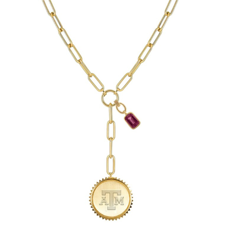 Elevate your game day style with the Sedum Necklace. Featuring a modern paperclip chain in silver-tone finish, the design showcases a bold circular pendant engraved with your schools iconic logo, framed with textured edging for a standout look. Plus a gemstone charm in your schools color, adds the perfect pop of school spirit, making this piece both fashionable and meaningful. Whether layered or worn solo, it’s the perfect accessory to show off your team pride with elegance.