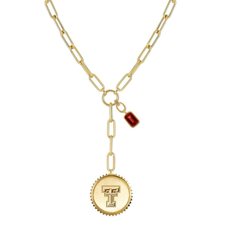 Elevate your game day style with the Sedum Necklace. Featuring a modern paperclip chain in silver-tone finish, the design showcases a bold circular pendant engraved with your schools iconic logo, framed with textured edging for a standout look. Plus a gemstone charm in your schools color, adds the perfect pop of school spirit, making this piece both fashionable and meaningful. Whether layered or worn solo, it’s the perfect accessory to show off your team pride with elegance.