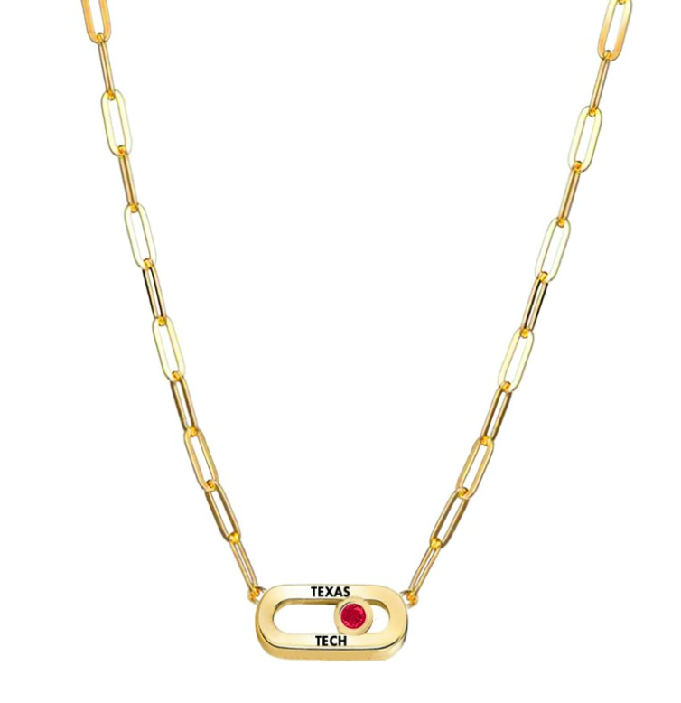 The Winter Berry Necklace is a chic and modern piece that blends subtle elegance with school spirit. Featuring a single chain and a sleek sideways oval-inspired pendant, this design is engraved with your school’s name along the side and accented with a sparkling gemstone in your team’s color. Stylish enough for everyday wear yet special enough for game day, it’s the perfect necklace to keep your school pride close to heart.